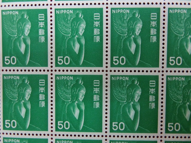 -----------------------商品説明-----------------------■品物 50円切手 中宮寺菩薩像 普通切手 100枚シート 第4次ローマ字入り ■状態 美品 ※完品 折り目、汚れ、ホッチキス跡などがない、とても綺麗なお品。 ※美品 パッと見て綺麗なお品ですが、中央の折り目やホッチキスの跡、目立たないシミなどが有る場合があります。 ※並品 パッと見で、汚れ等があるお品。 ■カラーマーク シリーズや発売時期により、カラーマークの有無や、場所などが異なりますが、 当店では選べません。 ■在庫 在庫については、店舗販売もしておりますので、 ご注文頂いた全てをご用意できない場合もございます。 カートに在庫がない場合にもお問い合わせいただければご相談をお受けいたします。 ■切手の種類 □普通切手とは 現在郵便局で普通切手とし販売されている物です。通常切手とも言われてます。 □記念切手とは 過去に販売された特殊切手・ふるさと切手・グリーティング切手、旧普通切手です。 □別納用切手 郵便局へのお支払いに、現金の代わりに切手でお支払いできる切手(別納用)です。 料金別納郵便、料金受取人払い、ゆうパック、国際郵便EMSのコスト削減に利用できます。 □別納用切手 台紙貼り A3サイズコピー用紙に別納用切手を貼ったものです。切 ■普通切手の歴史 日本最初の切手は竜切手 国家元首の肖像を意匠とすることの多い世界的傾向とは異なり、 天皇の肖像を意匠としたことはないが、 天皇の身代わりとして明治から昭和にかけての高額普通切手の意匠に神功皇后の肖像が採用されたことはある。 これには明治天皇の意向が反映されているといわれている。 明治初期に紙幣と切手製造の基礎を構築した、イタリア人技術者エドアルド・キヨッソーネは、 日本も紙幣や切手に国家元首の肖像(御真影。これ自体、彼の手になる肖像画を、 写真撮影したものである。)を使うのが妥当であるとしていた。 しかし、明治天皇が生来の写真嫌いで拒否されたという。 天皇が神格化されたこともあって、天皇を切手の意匠とするのはタブーとされるようになった。 以降、日本では記念・特殊切手も含めて在位中の天皇が切手の意匠になったことはない。 明治から昭和初期にかけては証票的な意匠となっていたが、 それ以降は徐々に具体的なモチーフを意匠とすることが多くなった。 第二次世界大戦中には逓信省も戦意昂揚の一翼を担い、大東亜共栄圏の地図や戦闘機、 少年航空兵、靖国神社など国家主義的、軍国主義的な意匠となった。 戦後は一転して産業、風景、動植物、文化財を意匠とするようになった。 このような事情を踏まえた切手収集家による分類方法が確立している(後述)。 なお、「昭和」「平成」といった元号名が含まれるシリーズ名があるが、 改元は普通切手のシリーズ変更と直接の関係はないため、 普通切手シリーズの発売期間は必ずしも時代ごとの区分と一致しない。 現在、郵便事業を担う日本郵便の発行する普通切手のテーマは 「日本の自然」であり、日本国内に生息する鳥類や花や昆虫を意匠としている。 日本切手カタログ(さくら日本切手カタログ・日本切手専門カタログ・ビジュアル日本切手カタログ)には 「平成切手」というシリーズ名称で収録されており、切手収集家の間でも使用されている。 ◇日本の切手の有効性 下記以外の切手は、たとえ銭位・厘位であっても無効を定めた法令がないため、 現在でも使用可能である。 したがって現在有効な最古の切手は1876年(明治9年)発行の5厘切手(旧小判切手)である。 なお銭は円の百分の一、厘は銭の十分の一である。 手彫切手(竜文切手、竜銭切手、桜切手及び鳥切手)と 旧小判切手(5厘を除く)は法令により1889年12月1日以降使用禁止となった。 「第一回国勢調査紀念切手」(1920年9月25日発売)は発売開始当初から有効期限(1921年3月31日迄)が定められていた。 第二次世界大戦後、GHQから軍国主義的あるいは神道等の象徴に関係があると みなされた切手や葉書(いわゆる追放切手)は法令[8]により1947年9月1日以降使用禁止となった。 これらは現在でも東京中央郵便局で現行の有効な切手および葉書に引き換えることができる。 ■日本の普通切手の一覧 □竜文切手 1871年 日本最初の切手、通貨制度が江戸時代と同じだったため額面が「文」表示。 目打が無く、裏面に糊もついていなかった。 □竜銭切手 1872年 通貨制度近代化により額面が「銭」表示となる。初めて目打が入れられたのもこの切手からである。 □桜切手 1872年 - 1876年 四隅に桜花をあしらっていたことに由来する名称。 途中から在庫管理のため、印面にカナが加えられた。 また、民間の印刷会社である松田印刷が印刷を担ったシリーズも存在する。 カナを含め、数多くのバリエーションがあり、日本切手の収集家の人気が最も高いシリーズである。 この切手の途中から、政府のみが切手の印刷を行うようになる。 このシリーズから切手に菊花紋章を表示するようになった。 □鳥切手 1875年 