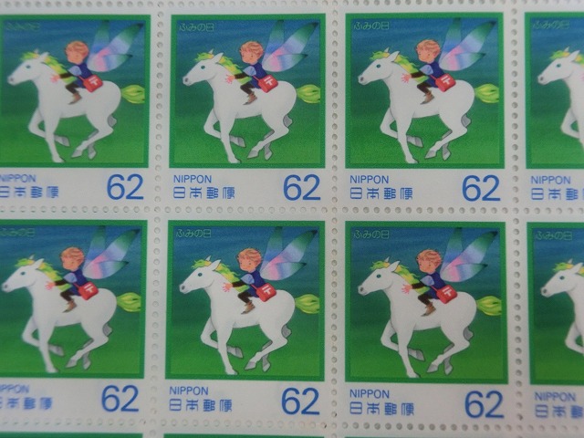 -----------------------商品説明-----------------------■品物 62円切手 夢の草原 ふみの日 50枚シート ■状態 美品 ※完品 折り目、汚れ、ホッチキス跡などがない、とても綺麗なお品。 ※美品 パッと見て綺麗なお品ですが、中央の折り目やホッチキスの跡、目立たないシミなどが有る場合があります。 ※並品 パッと見で、汚れ等があるお品。 ■カラーマーク シリーズや発売時期により、カラーマークの有無や、場所などが異なりますが、 当店では選べません。 ■在庫 在庫については、店舗販売もしておりますので、 ご注文頂いた全てをご用意できない場合もございます。 カートに在庫がない場合にもお問い合わせいただければご相談をお受けいたします。 ■切手の種類 □普通切手とは 現在郵便局で普通切手とし販売されている物です。通常切手とも言われてます。 □記念切手とは 過去に販売された特殊切手・ふるさと切手・グリーティング切手、旧普通切手です。 □別納用切手 郵便局へのお支払いに、現金の代わりに切手でお支払いできる切手(別納用)です。 料金別納郵便、料金受取人払い、ゆうパック、国際郵便EMSのコスト削減に利用できます。 □別納用切手 台紙貼り A3サイズコピー用紙に別納用切手を貼ったものです。切 ■普通切手の歴史 日本最初の切手は竜切手 国家元首の肖像を意匠とすることの多い世界的傾向とは異なり、 天皇の肖像を意匠としたことはないが、 天皇の身代わりとして明治から昭和にかけての高額普通切手の意匠に神功皇后の肖像が採用されたことはある。 これには明治天皇の意向が反映されているといわれている。 明治初期に紙幣と切手製造の基礎を構築した、イタリア人技術者エドアルド・キヨッソーネは、 日本も紙幣や切手に国家元首の肖像(御真影。これ自体、彼の手になる肖像画を、 写真撮影したものである。)を使うのが妥当であるとしていた。 しかし、明治天皇が生来の写真嫌いで拒否されたという。 天皇が神格化されたこともあって、天皇を切手の意匠とするのはタブーとされるようになった。 以降、日本では記念・特殊切手も含めて在位中の天皇が切手の意匠になったことはない。 明治から昭和初期にかけては証票的な意匠となっていたが、 それ以降は徐々に具体的なモチーフを意匠とすることが多くなった。 第二次世界大戦中には逓信省も戦意昂揚の一翼を担い、大東亜共栄圏の地図や戦闘機、 少年航空兵、靖国神社など国家主義的、軍国主義的な意匠となった。 戦後は一転して産業、風景、動植物、文化財を意匠とするようになった。 このような事情を踏まえた切手収集家による分類方法が確立している(後述)。 なお、「昭和」「平成」といった元号名が含まれるシリーズ名があるが、 改元は普通切手のシリーズ変更と直接の関係はないため、 普通切手シリーズの発売期間は必ずしも時代ごとの区分と一致しない。 現在、郵便事業を担う日本郵便の発行する普通切手のテーマは 「日本の自然」であり、日本国内に生息する鳥類や花や昆虫を意匠としている。 日本切手カタログ(さくら日本切手カタログ・日本切手専門カタログ・ビジュアル日本切手カタログ)には 「平成切手」というシリーズ名称で収録されており、切手収集家の間でも使用されている。 ◇日本の切手の有効性 下記以外の切手は、たとえ銭位・厘位であっても無効を定めた法令がないため、 現在でも使用可能である。 したがって現在有効な最古の切手は1876年(明治9年)発行の5厘切手(旧小判切手)である。 なお銭は円の百分の一、厘は銭の十分の一である。 手彫切手(竜文切手、竜銭切手、桜切手及び鳥切手)と 旧小判切手(5厘を除く)は法令により1889年12月1日以降使用禁止となった。 「第一回国勢調査紀念切手」(1920年9月25日発売)は発売開始当初から有効期限(1921年3月31日迄)が定められていた。 第二次世界大戦後、GHQから軍国主義的あるいは神道等の象徴に関係があると みなされた切手や葉書(いわゆる追放切手)は法令[8]により1947年9月1日以降使用禁止となった。 これらは現在でも東京中央郵便局で現行の有効な切手および葉書に引き換えることができる。 ■日本の普通切手の一覧 □竜文切手 1871年 日本最初の切手、通貨制度が江戸時代と同じだったため額面が「文」表示。 目打が無く、裏面に糊もついていなかった。 □竜銭切手 1872年 通貨制度近代化により額面が「銭」表示となる。初めて目打が入れられたのもこの切手からである。 □桜切手 1872年 - 1876年 四隅に桜花をあしらっていたことに由来する名称。 途中から在庫管理のため、印面にカナが加えられた。 また、民間の印刷会社である松田印刷が印刷を担ったシリーズも存在する。 カナを含め、数多くのバリエーションがあり、日本切手の収集家の人気が最も高いシリーズである。 この切手の途中から、政府のみが切手の印刷を行うようになる。 このシリーズから切手に菊花紋章を表示するようになった。 □鳥切手 1875年 外国郵便開業に伴い、外