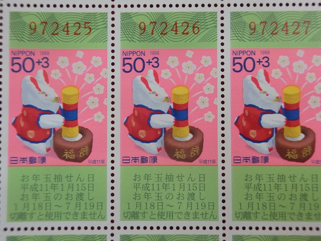 平成11年 50円 50枚シート くじ付き 佐原張子 餅つきうさぎ 年賀切手 | ||||